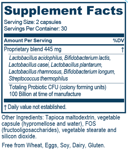 PROBIOTIC 100B™ offers a combination of seven different strains of healthy bacteria of human origin to support a healthy immune system. * These cultures are manufactured through a fermentation process and then freeze-dried and blended with fructooligosaccharides (FOS). Shelf-stastable for two years at room temperature, the nitrogenpacked capsules guarantee longer life and maintain their stability for years if refrigerated. Probiotic 100B contains the following live strains: L. acidophilus 50%; L. casei 10%; L. plantarum 10%; L. rhamnosus 10%; B. lactis 10%; B. longum 5%; and S. thermophilus 5%.