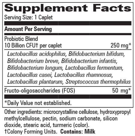 A specially developed probiotic formula featuring 10 high quality probiotic species, for a total of about 10 Billion CFU (colony forming units) per caplet.
