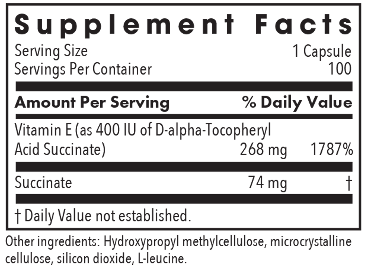 Vitamin E as d-alpha-tocopheryl acid succinate, as a dry powder in a hard-shell vegetarian capsule. Provides vitamin E, and succinate, which plays a role in the Krebs cycle, our major metabolic pathway for generating energy.* Vitamin E plays a role in lipid metabolism, and is a fatsoluble antioxidant with liver-protective activity.* Succinate plays a role in the Krebs cycle, our major metabolic pathway for generating energy.* Vitamin E also supports normal, healthy cardiovascular, liver, and cellular membrane function, and may interact beneficially with the other fat-soluble vitamins.*