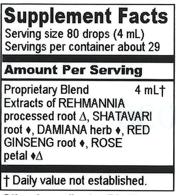 Hydroalcoholic extracts of processed Rehmannia root (Rehmannia glutinosa), Shatavari root (Asparagus racemosa), Damiana herb (Turnera dif-fusa), Red Ginseng root (Panax ginseng), Rose Petal flowers (Rosa gallica, Rosa damascena, Rosa centifolia)